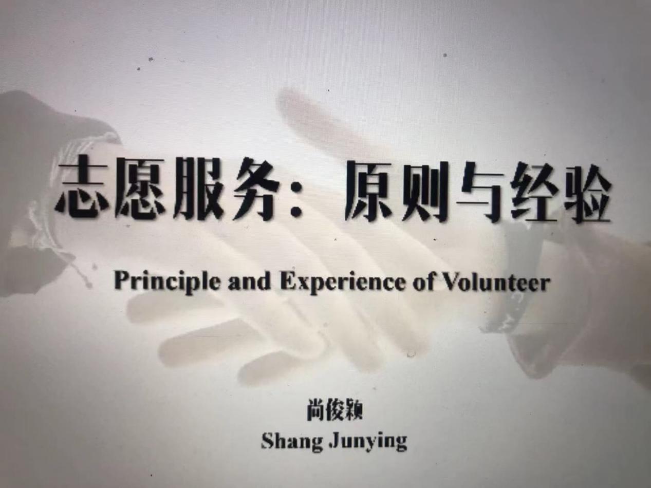 北京大学政府管理学院2019级博士生,曾获“北京大学学生年度人物·2019”“北京大学第13届演讲十佳冠军”“海淀区十大明星志愿者”称号的尚俊颖同学就“志愿服务的原则与经验”主题与助管助教同学们作详细分享。他提出“什么是志愿?”引导同学们思考,总结四个关键词概括“志愿”的含义,分别是自愿、无偿、公益以及平等。他认为,作为一名志愿者,在面对志愿服务对象之间,不存在上下级、同情施舍的关系。接着他又提出如何做好志愿工作的三个基础:第一,提供需求导向的有效服务。第二,注重感受的友情服务。第三,进行可持续的永恒服务。他认为,志愿服务能够建设构建“共同体”,包括不同群体和不同阶层的社会共同体、与利益共同体相对的情感共同体、跨越国界的命运共同体。尚俊颖最后总结,志愿服务是弥补不同阶层的粘合剂,亦是构建情感认同的重要纽带。互动环节,同学们就跨文化志愿服务经历及应急处突等问题和尚俊颖进行了热烈交流。