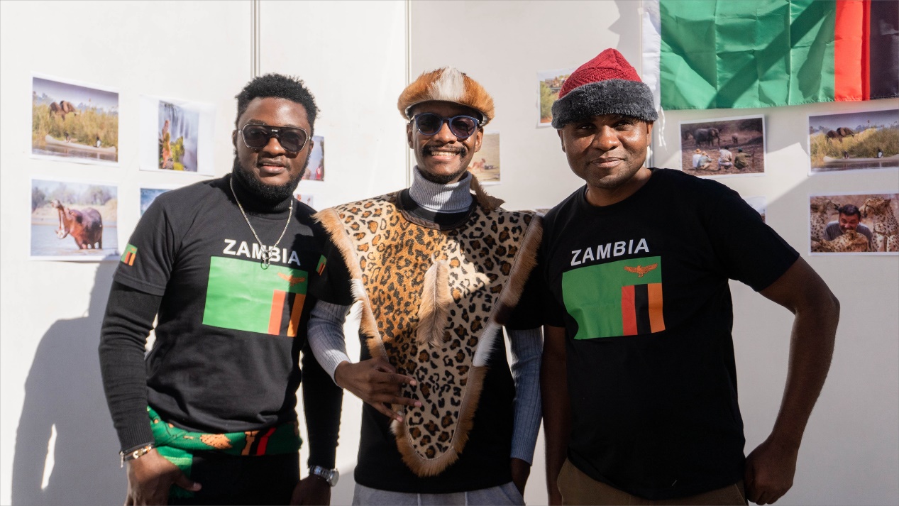 阿根廷展位前,身着特色服饰的学生与梅西立牌合影