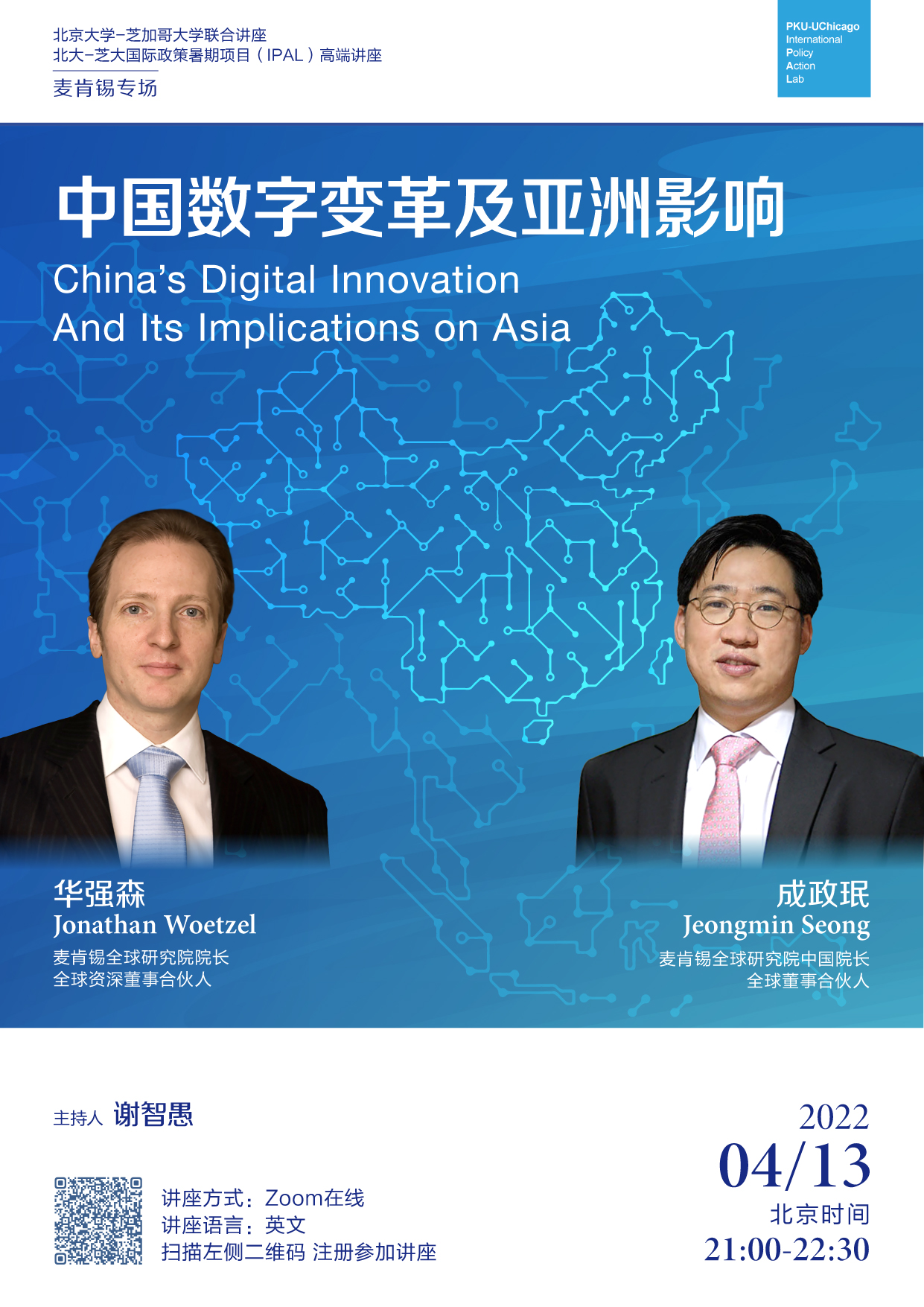 2022年4月13日晚,北大-芝大联合系列讲座、北大-芝大国际政策暑期项目高端对话隆重推出麦肯锡专场。麦肯锡全球研究院院长、全球资深董事合伙人华强森博士(Jonathan Woetzel)、麦肯锡全球研究院中国院长、全球董事合伙人成政珉先生(Jeongmin Seong)共同围绕“中国数字变革及亚洲影响”分享洞见、交流思想。