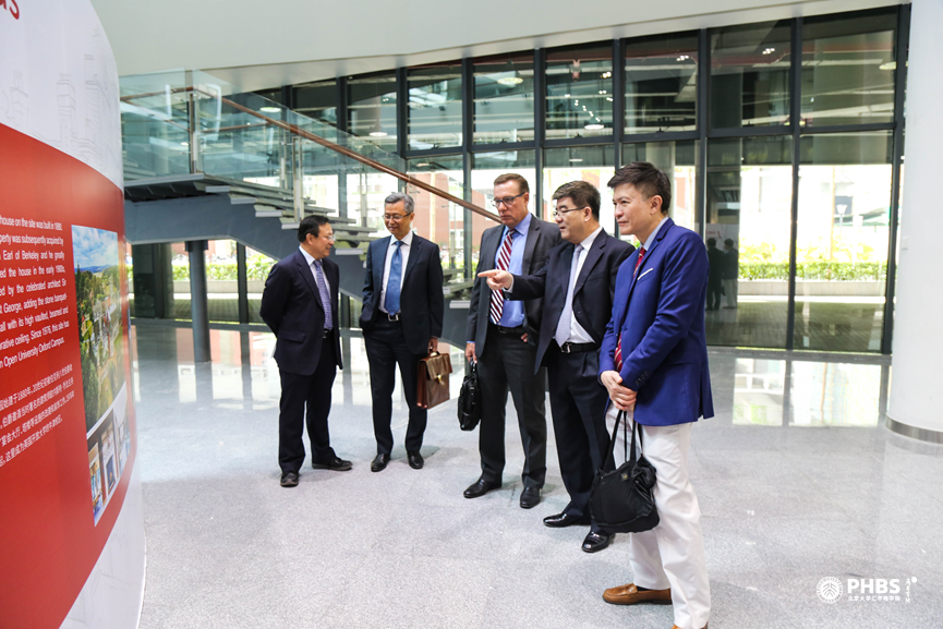 参观“百廿北大•商学薪传”北京大学120周年校庆暨北京大学英国校区启动特展时,海闻院长向AACSB商学院认证同行专家评审组介绍英国校区发展情况