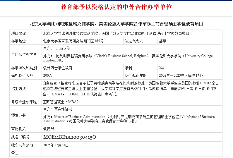 经教育部批准,我校目前在运行的中外合作办学项目有:北京大学与比利时弗拉瑞克商学院、英国伦敦大学学院合作举办工商管理硕士学位教育项目(批准书编号:MOE11BE1A20030415O)、北京大学与新加坡国立大学合作举办西方经济学专业硕士研究生教育项目(批准书编号:MOE44SG1A20131464N)、北京大学与新加坡国立大学合作举办企业管理专业(金融工程)硕士研究生教育项目(批准书编号:MOE44SG1A20141680N)。
