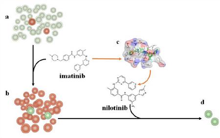 图1.靶向药物耐药突变预测新策略示意图。初始的癌细胞群体(a)中大部分为药物敏感细胞,少量为耐药细胞,经过一段时间的第一代药物临床治疗后,药物失效,癌细胞群体逐渐改变到状态(b);这时必须使用第二代药物进行治疗才能继续杀死癌细胞;经过一段时间的应用后,第二代药失效,需要第三代药,该过程不断重复,新一代药物的研发需要紧跟癌细胞耐药性的发展;而对最新一代上市药物产生耐药性的病人面临无药可用的困境。本工作所发展的抗耐药性药物研发新策略(c), 可以在药物耐药细胞出现的前1-3年进行新一代药物的前瞻性研发,从而加速抗耐药性药物研发的进程,为临床耐药性突变做好药物储备。