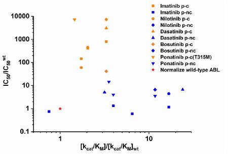图2.与野生型相比,药物对临床中发生的耐药性突变体具有更高的半数抑制浓度,临床中发生的耐药性突变体通常不会大幅度改变其酶动力学常数;而药物对未在临床中出现的突变体的半数抑制浓度变化不大,且未在临床中出现的突变体的酶动力学常数一般相对野生型变化较大。临床中发生的耐药性突变体和未在临床中出现的突变体具有明显的分割区间。