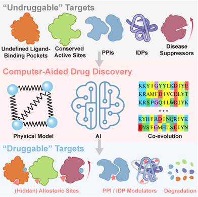 作者在展望中指出,尽管靶向无序蛋白、蛋白-蛋白相互作用、别构调控以及蛋白降解等领域已取得了显著进展,但这些研究方向仍存在重大挑战。例如,无序蛋白配体的优化存在很大困难,而隐藏别构位点的发现也面临挑战。随着新药物靶标的不断发现及其结构与功能研究的深入,潜在的治疗靶标空间正在不断扩大,RNA等非蛋白质靶标的小分子配体发现愈发受到关注。因此,构建靶标特异性的化合物库,探索更大的化学空间,发展基于AI的药物生成模型,并发展高通量实验方法结合计算预测来探索可合成的类药分子空间是值得关注的方向。另一方面,与靶标结合的蛋白质及多肽设计也为不可药靶标的可药性提供了新的可能。这些创新的发展策略将会在不久的将来将大多数“不可药”靶标转变为可药靶标,为相关疾病带来新的治疗机会。