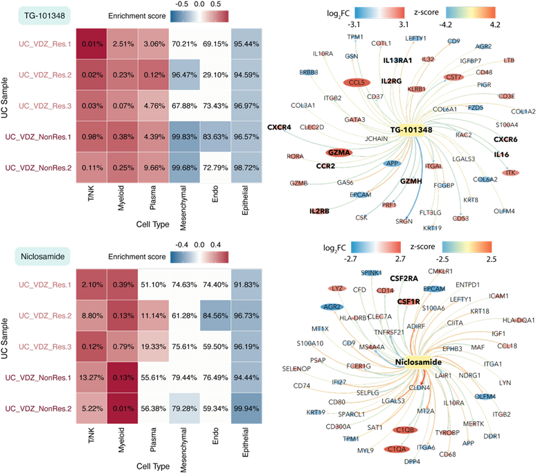 SOAR成功将空间组学数据与药物靶点数据库整合,为用户提供靶点发现与药物筛选功能,助力未来的精准医学研究与药物研发。在溃疡性结肠炎的研究中,SOAR 展示了其在免疫相关药物再定位方面的强大能力。利用SOAR平台,研究团队对来自健康对照与接受维得利珠单抗(vedolizumab)治疗的溃疡性结肠炎患者的空间组学数据进行了分析,并揭示了病灶区域中 T 细胞和髓系细胞(包括巨噬细胞和单核细胞)中JAK-STAT通路的异常激活。SOAR 精准识别出托法替尼(tofacitinib)、费德拉替尼(TG-101348)和氯硝柳胺(niclosamide)等JAK 抑制剂在免疫细胞中的显著抑制作用,而这一作用在传统治疗无效的维得利珠单抗无反应者中尤为明显。SOAR的药物干扰分析显示,这些小分子可有效抑制多种促炎细胞因子及其受体(如 IL-2R、CSF1R、TNF 和 IL23A)的表达,进而下调炎症信号通路,减轻黏膜免疫细胞浸润和上皮损伤。这一结果不仅为炎症性肠病患者提供了具广谱免疫调节能力的治疗选择,也为未来组合治疗的临床试验设计提供了数据支持,凸显了 SOAR 在解析炎症机制与推动免疫相关药物研发方面的潜力。另外,通过分析癌症空间组学数据,SOAR成功预测并验证了西罗莫司(sirolimus)与曲古抑素A(trichostatin A)作为抗癌候选药物,能够靶向PI3K/Akt/mTOR通路,从而抑制癌细胞的生长与增殖。