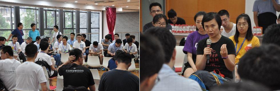 为促进营员们与定量生物学方向师生的进一步交流,中心于7月4日晚6点在吕志和三楼大厅精心组织了“Happy Hour”活动。来自中心的汤超老师,魏平老师,陶乐天老师,林一瀚老师,齐志老师,罗冬根老师,毛有东老师,李志远老师到场与营员们进行了交流,大家围坐在一起,营员们就研究方向和研究生生活等问题与老师们进行了热烈的讨论。