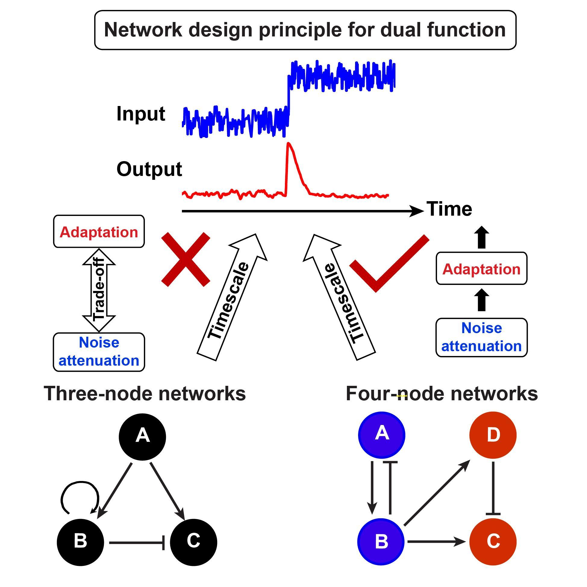 张磊课题组首先在三结点网络中发现了适应性要求的灵敏度和抗噪性之间存在一种内在的制约关系,从而阻碍了双功能的实现,即灵敏度越高,抗噪性越差;抗噪性越好,灵敏度越低。虽然利用时间尺度可以调节灵敏度和抗噪性之间的制约关系,但会导致适应时间的延长和不切实际的参数选择。相比之下,四结点网络可以通过模块拼接以及时间尺度匹配的策略,有效地解耦适应性与抗噪性,从而克服其制约关系以实现适应-抗噪双功能。从七个适应性生物系统的研究中发现,复杂的生物网络也经常采取适应性网络与抗噪性模块耦连的策略来提高其双功能的鲁棒性。