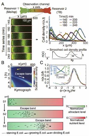 北京大学物理学院/北京大学定量生物学中心欧阳颀院士领导的“生物物理”团队的罗春雄研究组在基于微流体细菌趋化分析芯片的实验研究中发现:在反向不同引诱物浓度梯度下,细菌首先趋向聚集于强引诱物而少营养的一端, 但当细胞密度超过一个阈值时,细菌群落部分“逃逸”强引诱物浓度场,游向趋化因子相对弱但可代谢物质富集的一端。这一现象被刻画为细菌群体运动的“逃逸相变行为”。罗春雄研究组通过与美国IBM沃森研究中心的涂豫海教授(北大定量生物学中心资深访问学者)合作,对此现象涉及的趋化受体间的协作行为进行了系统细致的理论分析和实验论证,发现营养物质通过数量较少的Tap趋化受体进行了响应行为,而且在较大的一个趋化响应参数空间均会出现由细菌密度超过临界密度而产生的逃逸条带(“Escape Band”)行为,该行为可以使得细菌群落在复杂的趋化物浓度场中获得更好的生长优势。相关的定量实验与理论研究以“The escape band in Escherichia coli chemotaxis in opposing attractant and nutrient gradients”为题于2019年1月23日在线发表于Proceedings of the National Academy of Sciences of the United States of America(PNAS)杂志上。