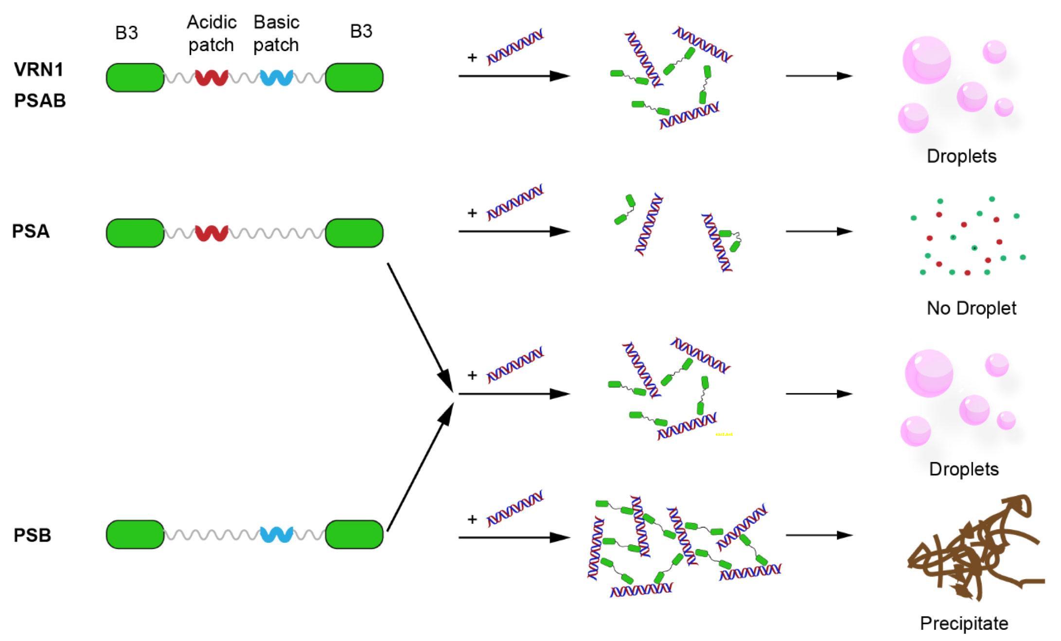图1. VRN1中间无序连接链上的电荷分布调控了VRN1与DNA形成的相分离