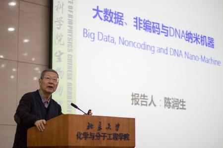 上午共有四位报告人进行特邀报告,分别由北京大学定量生物学中心的汤超教授和来鲁华教授主持。来自中科院生物物理所的陈润生院士作了题为大数据、非编码与DNA纳米机器的特邀报告。陈润生院士是中国最早从事生物信息学研究的科研人员之一,在生物信息学领域进行了系统的研究,为该领域的发展做出了突出的贡献。陈润生院士首先回顾了基因组测序的进展及其在精准医学中的应用,同时也分析了其面临的问题。之后,他与大家分享了自己在基因组非编码序列中的研究成果及心得,预测了之后的发展方向。最后,陈润生院士展望了位于研究前沿的DNA设计及DNA计算机未来的发展前景。