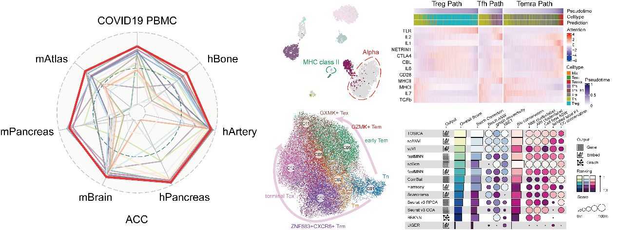 作者在多种不同的数据集中对模型的准确性进行了试验,包括疾病数据集,细胞类型不平衡数据集,发育数据集,复杂批次数据集,小鼠全组织图谱数据集。在横向比较的19种细胞类型注释器中,TOSICA综合准确性排名第一,运行时间随细胞数增加呈线性增加。值得注意的是,在规模大且细胞类型多的小鼠全组织图谱数据集和细胞类型不平衡数据集中,TOSICA的准确性分别领先第二名2%和6%。TOSICA还具有准确识别不同的新细胞类型,高灵敏鉴定过渡状态细胞,重构细胞动态轨迹,以及无需批次信息的批次效应去除等优秀特质。随后作者在泛癌浸润T细胞数据集,泛癌浸润髓系细胞数据集,COVID19疾病数据集,红斑狼疮(SLE)数据集中验证了TOSICA在解决实际科学问题中的优势和潜力。实现了疾病相关可解释动态轨迹重构,鉴定随年龄,疾病状态,癌症类型变化而活化的通路,细分功能的细胞亚群鉴定,以及跨不同疾病模型的细胞类型迁移。
