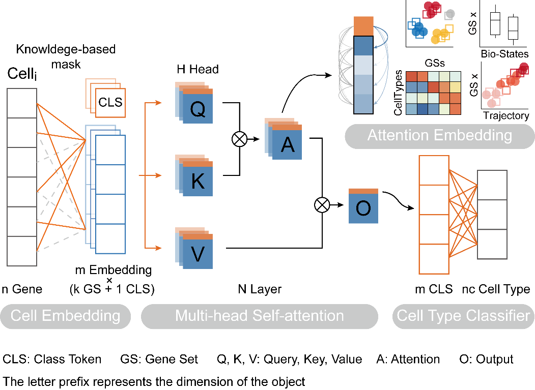 与基于特征基因或相关性的机器学习方法相比,深度学习方法往往更适合处理大数据,更高效,更自动化。目前已经有大量基于自编码器(Autoencoder,AE)及其各种变体的细胞类型注释方法被开发,但受限于AE模型结构本身带来的弊端,此类方法大多伴随着特征提取过程中的信息损失,需要额外批次信息的辅助去除批次效应,以及无法在不牺牲模型深度或能力的情况下赋予隐空间生物学可解释性等问题。Transformer是一种先进的,基于多头自注意力(Multi-head self-attention)机制的深度学习模型,拥有强大的全局信息集成能力和可解释性,它在自然语言处理(NLP)和计算机视觉(CV)等领域都取得了突破性进展。受这些优良特性的鼓舞,TOSICA 开创性的将Transformer计算单元运用到scRNA-seq数据分析领域。该模型首先将细胞中基因的表达信息转化成基因集特征(Gene set token)并添加一维用于分类的分类头(Class token),由于基因集间的离散特性,相对于传统Transformer模型,TOSICA无需位置信息编码(position embedding)而直接进入多头自注意力层进行特征集成,最后仅将class token接入分类器中得到细胞分类结果。