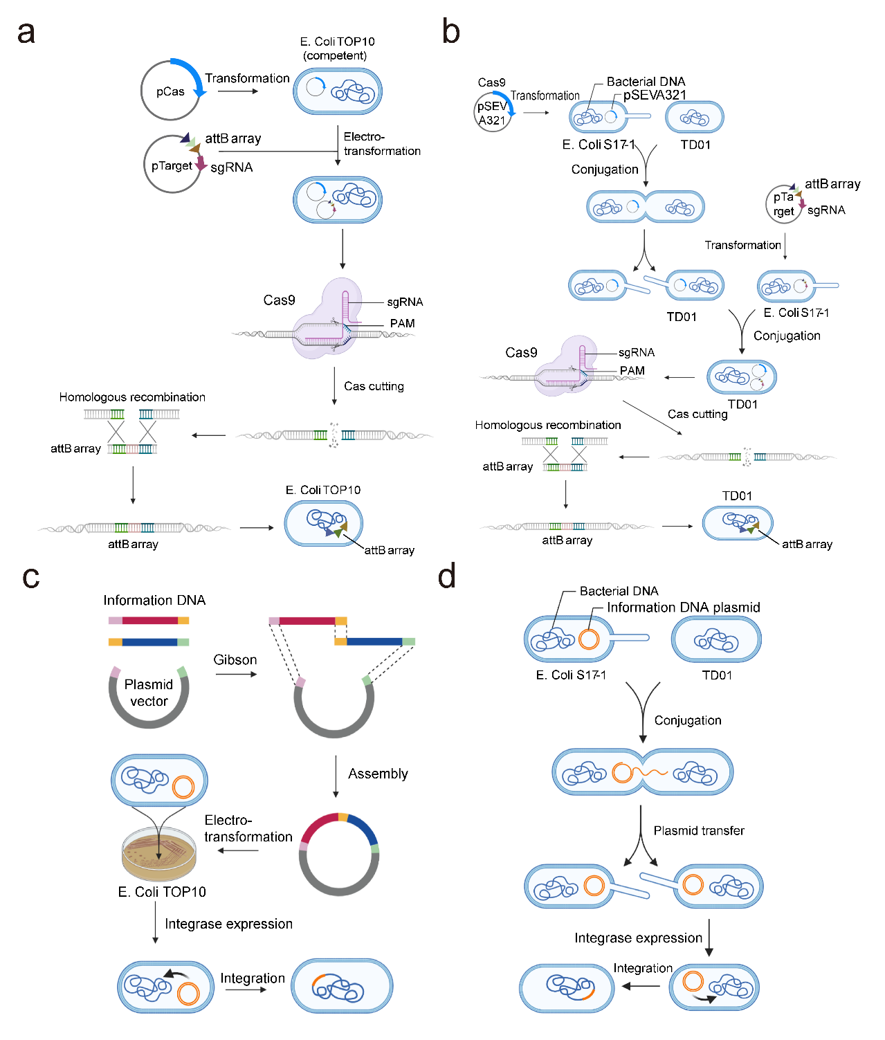 图1 使用RSGE工具箱,将存储人工信息的DNA片段整合到细菌基因组中。