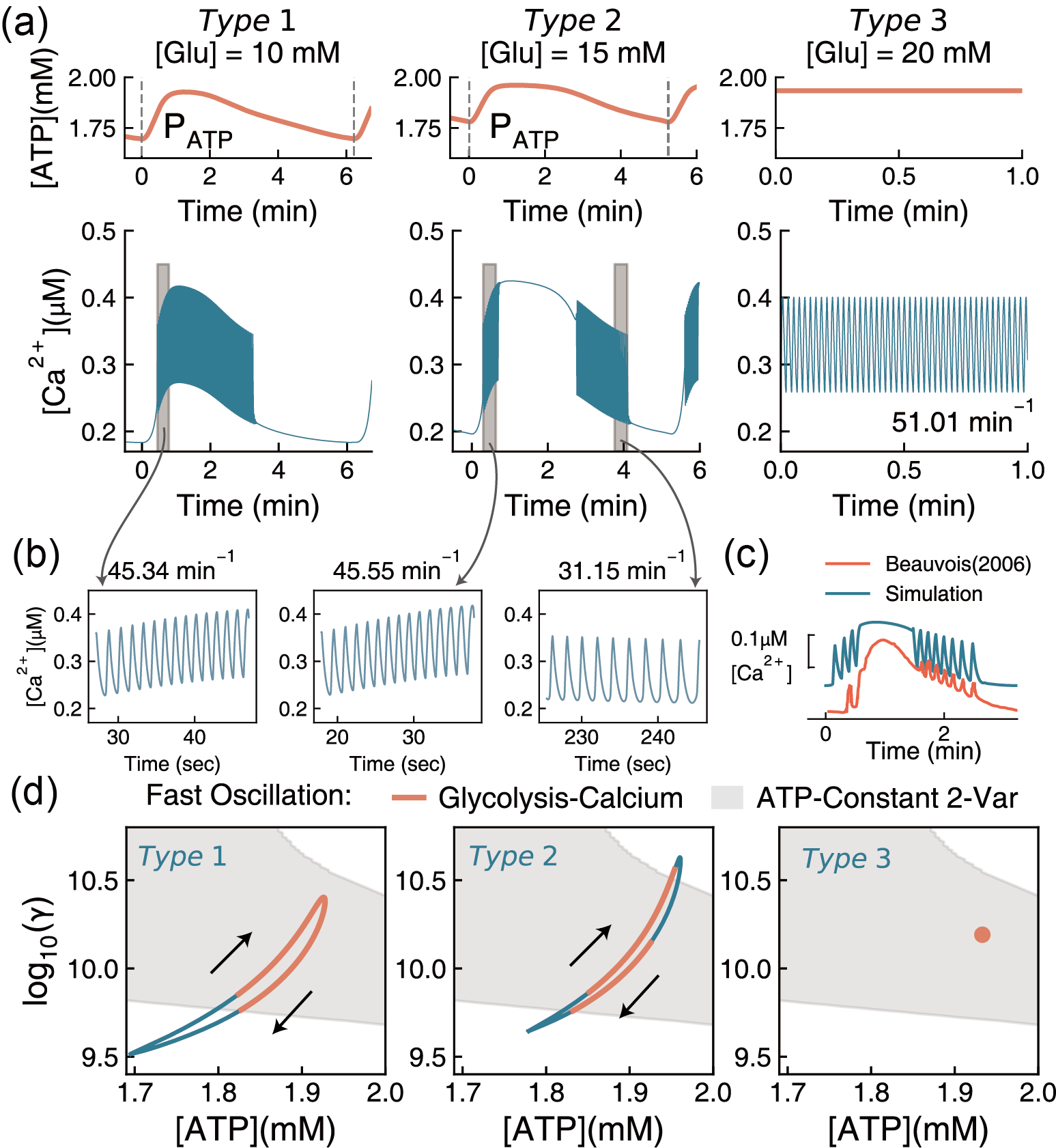 图4 不同糖浓度下诱导的钙离子振荡。(a-b)三种钙离子振荡模式(Type)和对应[ATP]响应。(c) 实验中被观测到模型预言的Type2钙振荡行为。(d)不同[ATP]与γ轨迹诱导下游的高频钙振荡(橙色),灰色为两变量模型预测的高频振荡区。