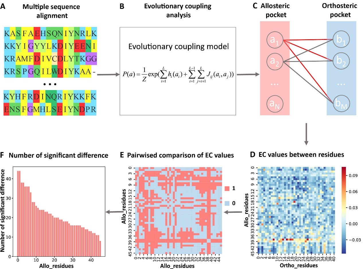 别构调控在众多生物学过程中发挥着重要作用,比如酶催化和信号传导。和传统的正构药物相比,别构药物由于具有更高的特异性、更少的副作用以及能有效克服存在的耐药性突变等独特优势而受到了广泛关注。但是别构分子的优化面临着很大的挑战,因为别构分子通常具有弱的构效关系(Flat structure-activity relationships),别构分子与靶标蛋白之间更高的结合亲和力常常并不对应着更好的活性。在别构位点中,每个残基对别构效应的贡献不一样,别构位点中的关键残基决定了别构信号的传导方向和强度,而其它残基则主要起辅助结合作用。找出别构位点中主要负责别构信号传导的残基(关键别构残基)对于理解别构调控机制和相关蛋白质与药物设计具有重要意义。目前还没有能够预测关键别构残基的有效方法,给别构分子的优化改造以及酶活性等蛋白质功能的别构调控研究带来了很大困难。