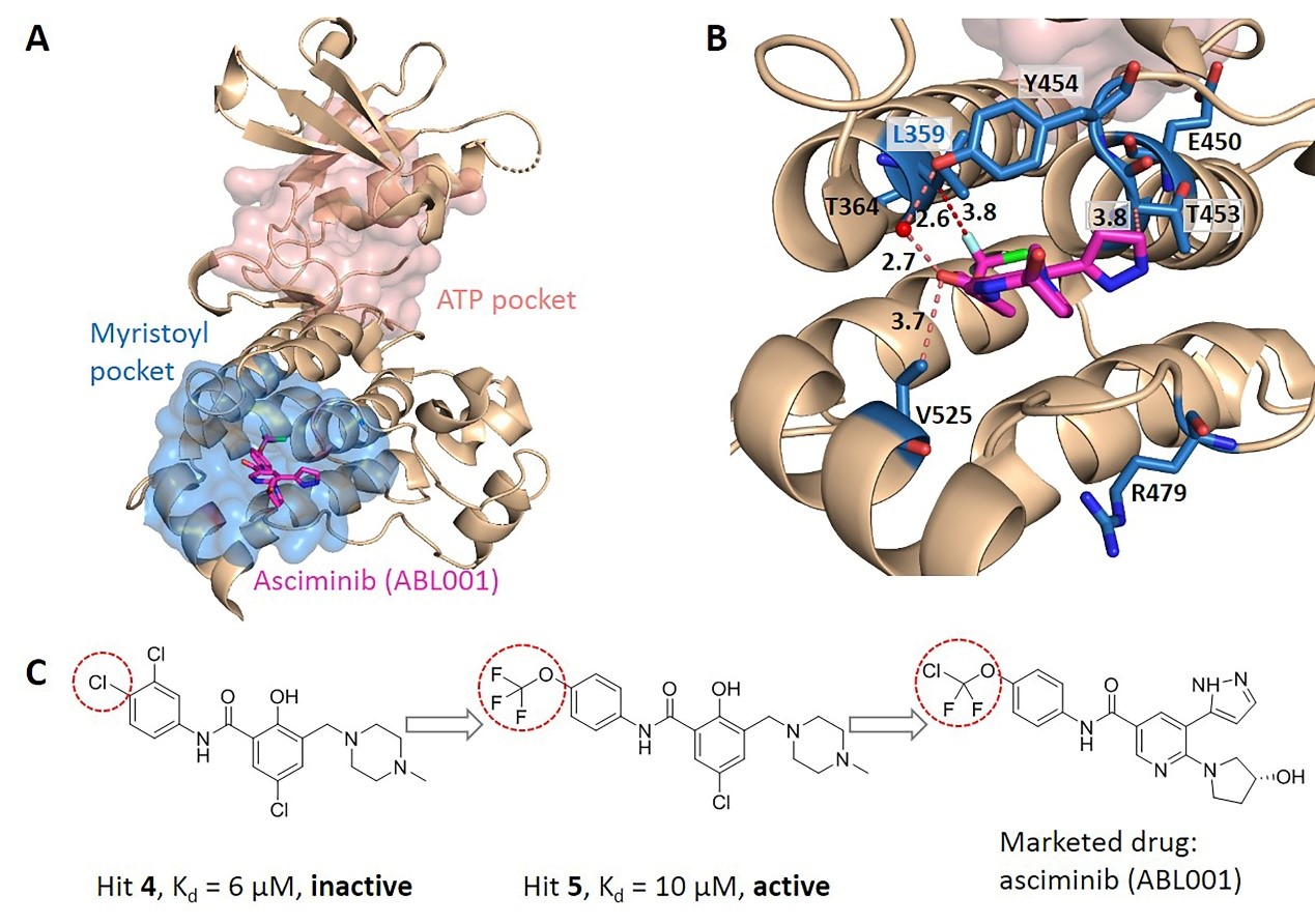 进一步通过两两比较别构口袋中的残基对应的进化耦合值之间的差异,推出别构口袋中的每个残基对应的显著性差异数,将残基对应的显著性差异数归一化成Z-score就可以预测出关键别构残基(图1)。该方法(KeyAlloSite)预测的关键别构残基与多个蛋白质体系中的实验结果相一致。例如,在酪氨酸蛋白激酶ABL1(BCR-ABL1)中,KeyAlloSite预测的关键别构残基L359在别构信号传导中起着关键作用。当别构分子hit 4和L359之间没有相互作用时,hit 4尽管结合较强但是没有活性。别构分子hit 5由于和L359之间存在有利的疏水相互作用,所以尽管和hit 4相比结合亲和力更弱,但却具有酶抑制活性(图2)。KeyAlloSite也成功预测了大肠杆菌化学趋向性受体Tar和PDZ3蛋白中的关键别构残基。