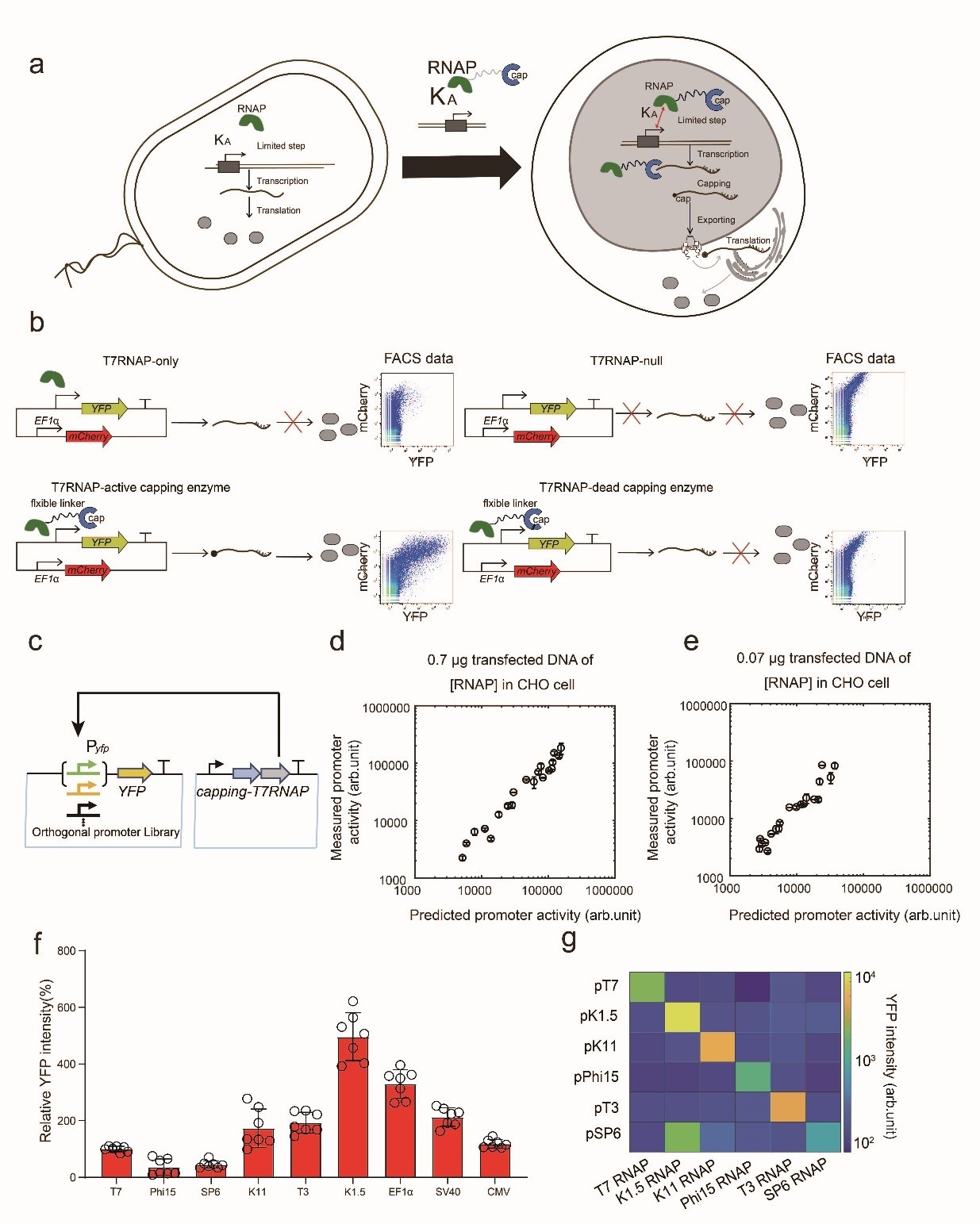 本文提出一种设计策略,旨在开发一种模块化、独立于宿主的正交型转录系统。该正交型转录系统由正交型启动子库和单体RNA聚合酶(RNAP)组成。该系统通过将RNA加帽酶与单体RNAP融合,确保病毒来源的单体RNAP在哺乳动物细胞中按照“跨域(domain)”方式实现基因转录、转录后修饰、出核和翻译等真核系统蛋白质表达的必需步骤(图1)。
