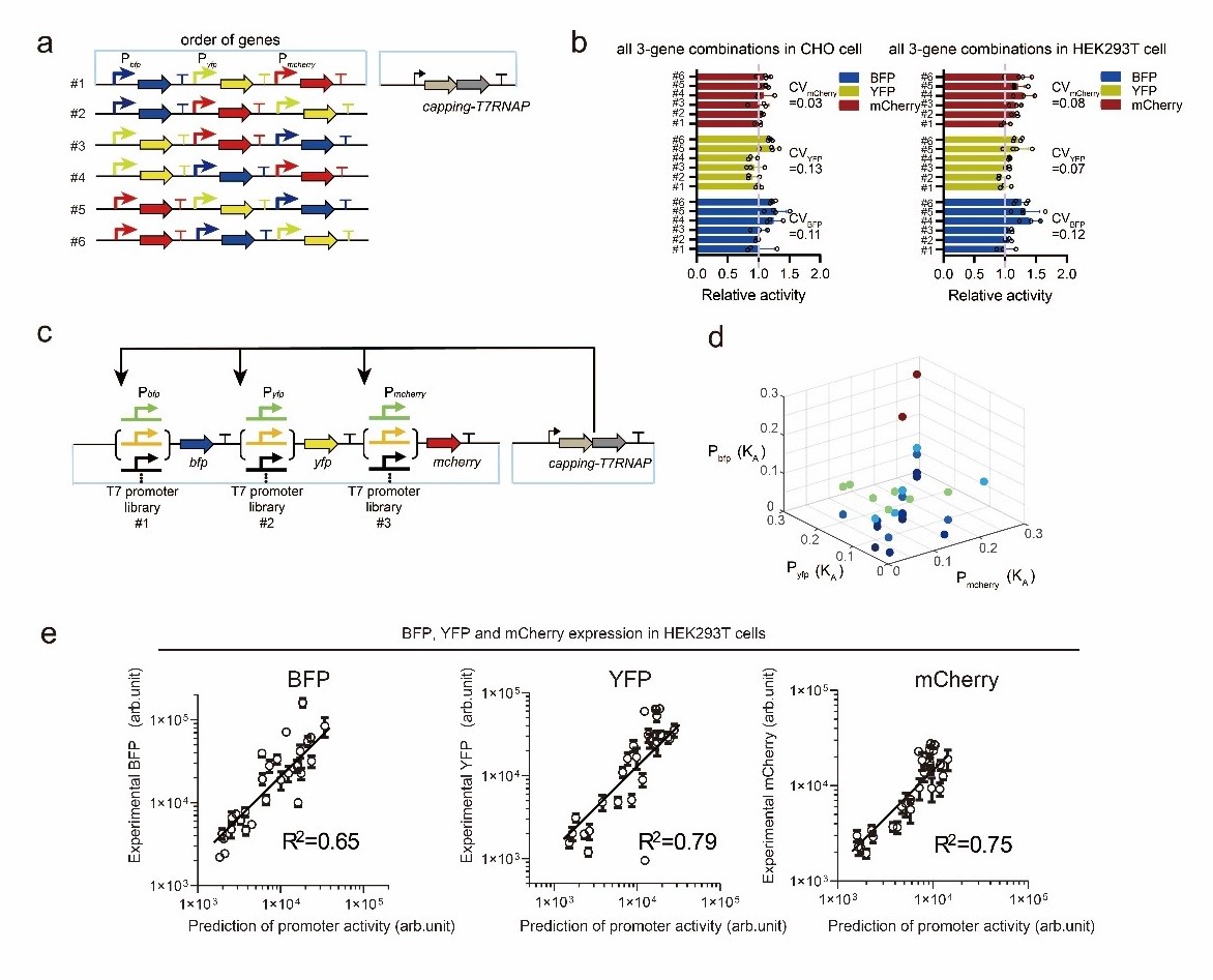 在哺乳动物细胞中,多个基因的先后顺序也会显著影响基因表达量。为了研究基因先后顺序对基因表达量的影响,研究团队设计了三个报告基因的六种可能的先后顺序(1-2-3, 1-3-2, 2-1-3, 2-3-1, 3-1-2, 3-2-1),并计算了报告基因在所有六种组合中的表达量的方差 (图3)。作者们发现同一启动子的表达量的方差系数(CV) 非常小。这个结果表明启动子活性不受其局部基因环境的显著影响,而且在CHO和HEK293T细胞株中都保持类似行为。另外,研究团队在50个启动子库中,针对三个不同报告基0因任意选择其启动子(活性变化100倍左右)。通过修正的反应动力学模型,文章预测了三种报告基因的活性。根据实验结果,文章发现哺乳动物细胞中的三个基因的表达量都可以由模型预测(R2=0.81~0.88)。