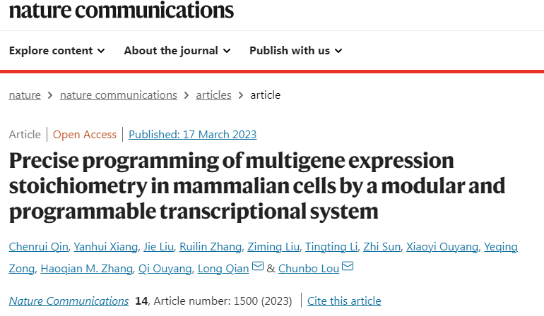 北京时间3月18日,北京大学前沿交叉学科研究院定量生物学中心钱珑/欧阳颀团队与中国科学院深圳先进技术研究院娄春波课题组合作在Nature Communications上发表精准控制哺乳动物细胞多个基因表达剂量比例的人工基因线路,题为“Precise programming of multigene expression stoichiometry in mammalian cells by a modular and programmable transcriptional system”。该工作通过在哺乳动物细胞中构建人工正交转录系统,实现了单个和多个启动子转录活性的精准微调,构建了具有定量预测能力的多基因表达比例的理性设计模型,并将这个定量模型应用于甲型流感病毒(H1N1)病毒样颗粒(VLP)组分与产量的优化设计。秦宸睿、项延会和刘杰为共同第一作者,中科院深圳先进院娄春波和北京大学钱珑为文章共同通讯作者。