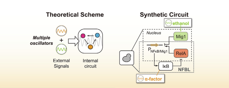 物理世界中,多个振荡波的相互叠加可能产生干涉条纹等复杂现象。事实上,周期振荡式的动力学行为不仅出现在物理现象中,在生命系统内也广泛存在。从生物钟、体节发育、神经冲动,到细胞周期、免疫调控、信号转导,生物系统中各组分的周期性变化帮助我们维持稳定的节律、产生正确的发育结构、对外界信息做出精准而定量的响应;在这些过程中,往往会涉及到多种振荡信号之间的相互作用。这种复杂系统中蕴含着怎样的调控原理,是一个重要却难解的问题。