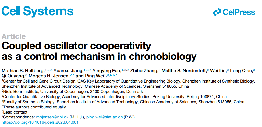 2023年5月17日,中国科学院深圳先进技术研究院/北京大学定量生物学中心魏平课题组与丹麦皇家科学院院长Mogens H. Jensen课题组合作在Cell Systems上发表研究论文“Coupled oscillator cooperativity as a control mechanism in chronobiology”,通过合成生物学方法构建了一种三元耦合振荡系统,并结合数学模型,首次深入地探讨了生命系统中多重耦合振荡系统中的调控机理。