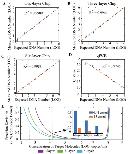 为了进一步测试芯片的动态范围、精确度、灵敏度等定量性能,作者使用了连续十倍稀释的β肌动蛋白DNA。DNA分子在芯片腔室中的随机分配符合泊松分布,因此,通过计数阳性分区数目利用泊松分布公式能够计算得到DNA模板数量。通过绘制预期和测量的DNA模板数量的对数,获得线性回归曲线,并与qPCR进行比较,结果表明,所有多层芯片中与预期的DNA模板数量非常匹配(图4A-C),qPCR方法只能得到Ct值,而不是精确的DNA数量或浓度(图4D)。dLAMP的测量数据和预期数据之间的线性关系优于qPCR。