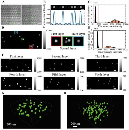 在该研究工作中,作者开发了一种3D可扩展的腔室阵列芯片,该芯片通过堆叠微腔室阵列层来增加分区的数量,并采用数字LAMP技术来定量DNA分子。与二维扩展相比,该芯片可以在不增加芯片尺寸、操作工作流复杂性和操作时间的情况下,大大增加分区数量,以提高数字PCR的性能,结合环介导等温扩增技术,反应更迅速,且能够降低数字PCR系统的复杂程度,设计出更加便捷、低成本的仪器系统。该项工作将微阵列扩展至6层,单芯片可分隔近40万微反应单元。进样和分隔可以在三分钟内完成,整个反应可以在1h内完成。