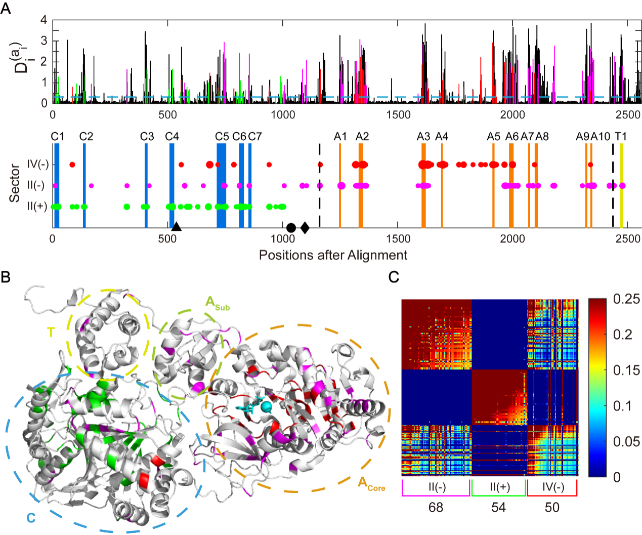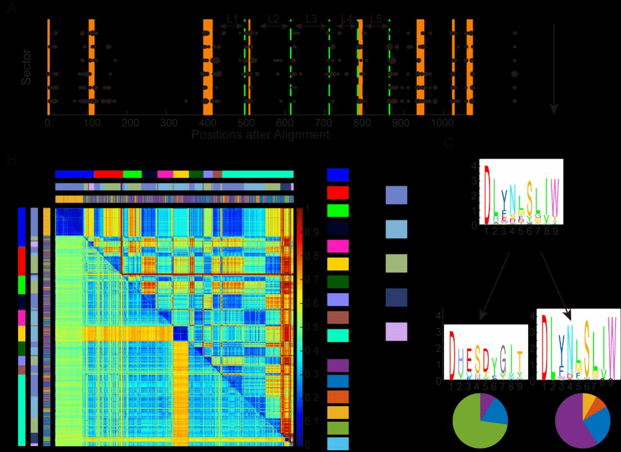 图2. 统计耦合分析揭示了NRPS中的共进化序列