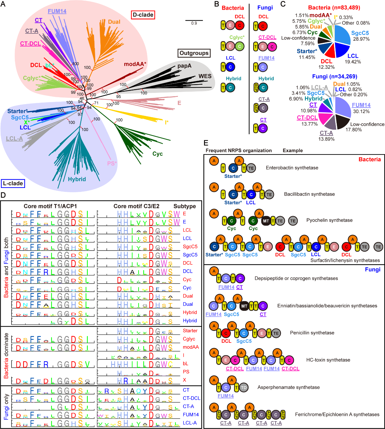 团队建立了迄今为止最全面的C domain演化树,得以追溯C domain的演化历史。在16,820个细菌基因组和2,505个真菌基因组中,团队分析了C domain的亚型分布,发现细菌和真菌中的偏好的C domain亚型完全不同。进一步比较了同种C domain亚型在细菌和真菌中的序列特征,发现即便是在同一亚型内,细菌和真菌的序列特征也不完全相同。最后,研究者基于全面的分型对基因组中的NRPS组织结构进行了统计,发现了一些典型的NRPS组织结构,其中多数的产物都是铁载体。
