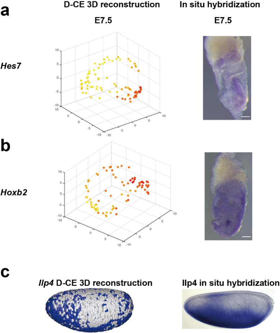 另外,D-CE算法准确地重建了寡聚细胞和单细胞的空间结构,并识别了许多在空间形态建成过程中先前未被重视或未被充分关注的调节因子,例如氧、细胞外基质和紧密连接梯度。这些梯度引导了许多生物过程的模式形成,包括但不限于胚胎和组织发育、再生以及癌症形成。为了验证D-CE算法能否准确识别空间特征基因,研究者使用全胚胎原位杂交实验对于该算法在小鼠胚胎数据中识别的空间特征基因进行了验证。结果表明,D-CE算法成功识别了具有较强空间特异性表达的空间特征基因。