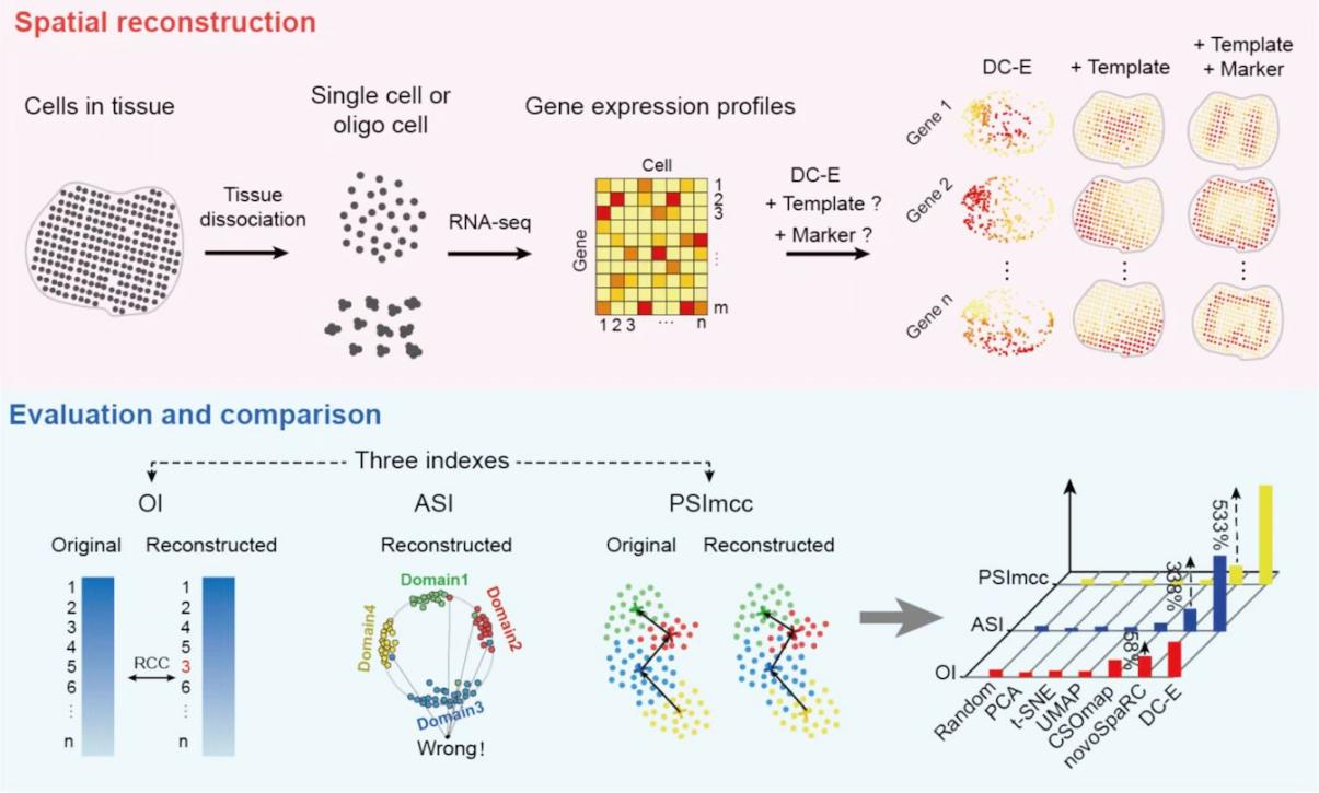 近日,北京大学定量生物学中心韩敬东教授团队同清华大学脑与智能实验室Carlo Vittorio Cannistraci教授合作在Advanced Science 杂志上发表了题为Spatial Reconstruction of Oligo and Single Cells by De Novo Coalescent Embedding of Transcriptomic Networks的研究论文,在论文中,研究者建立了一种单细胞/寡细胞转录组数据从头空间重构算法,De Novo Coalescent Embedding (D-CE)。该研究利用细胞-细胞转录相关网络的非线性嵌入方法,从头重构了单细胞转录组数据在空间中的位置信息。基于这一空间重构结果,他们成功实现了对应于组织空间特异性基因和空间域的识别。