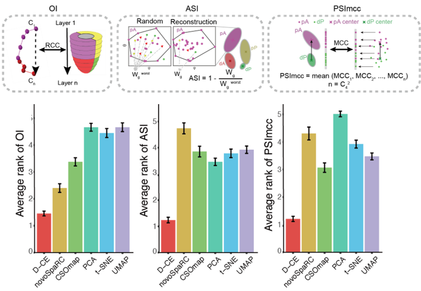 为了验证空间重构方法的有效性,研究者使用来自人类、小鼠、果蝇和斑马鱼等多个不同物种的组织转录组数据,重构了对应组织的空间基因表达模式。同时,他们以已知样本空间域标签或对应组织空间特征基因表达特征为金标准,并设计了指标来衡量空间重构的性能。结果表明,D-CE算法在空间重构上具有良好的效果,并且其性能优于目前已知的从头空间重构算法(novoSpaRc和CSOmap)和转录组分析中常用的降维可视化方法。