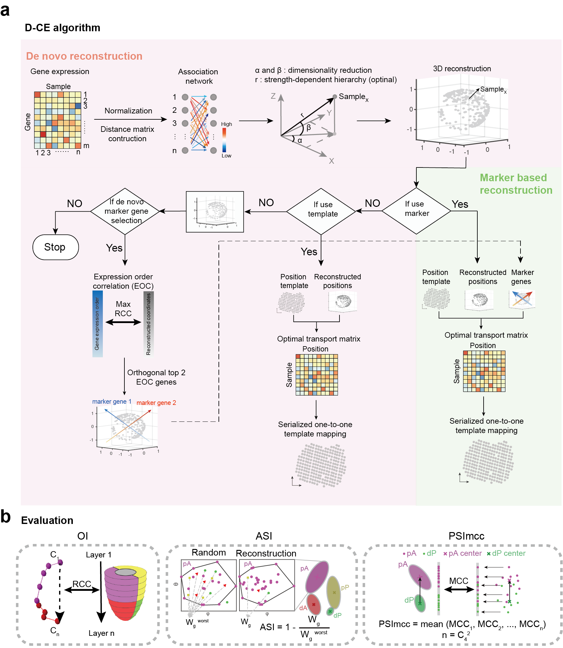 为了使得重构出的空间结构更符合目标组织的真实形状,研究者通过最优传输理论设计了空间模板拟合步骤。该步骤可以根据目标组织的空间形状模板和模板上的空间特征基因表达信息,对D-CE重构的结构进行优化,从而获得更贴合于目标组织结构的空间重构结果。