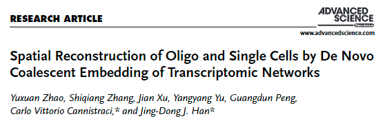 [1] Zhao Y, Zhang S, Xu J, et al. Spatial Reconstruction of Oligo and Single Cells by De Novo Coalescent Embedding of Transcriptomic Networks. Adv Sci (Weinh). 2023;e2206307. doi:10.1002/advs.202206307