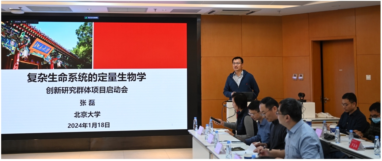 2024年1月18日国家自然科学基金创新研究群体“复杂生命系统的定量生物学”项目启动会在北京大学定量生物学中心吕志和楼隆重举行。国家自然科学基金委员会交叉科学部主任汤超院士、科技部基础研究司王嵩副司长、国家自然科学基金委员会交叉科学一处戴亚飞副处长、北京大学欧阳颀院士、清华大学王志新院士、北大科研部张存群副部长、创新研究群体项目团队成员及定量生物学中心教师等出席会议。参会的项目专家组还包括中科院上海生命科学研究院研究员陈洛南、中科院物理所研究员李明、复旦大学教授林伟、香港浸会大学教授汤雷翰、中科院数学与系统科学研究院研究员王勇、浙江大学教授周如鸿。会议由北京大学定量生物学中心副主任来鲁华教授主持。