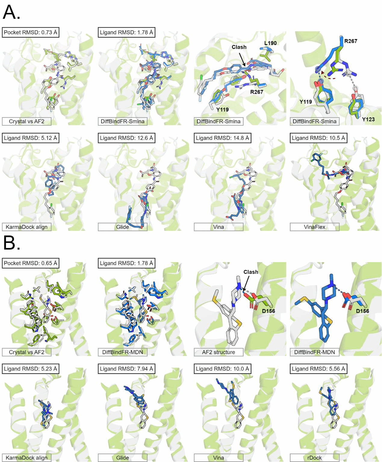 图2. 两个GPCR-AF2子测试集上的对接案例。其中,蛋白和配体复合物的晶体结构以灰色显示。AlphaFold2建模的蛋白结构以淡绿色显示。DiffBindFR以AlphaFold2建模的主链结构为输入,柔性对接得到的配体和口袋侧链以蓝色显示。每个小图的底部左侧为使用的对接方法。Pocket RMSD为Holo态与AF2结构之间的口袋Cα RMSD。(A)AlphaFold2预测的Human cysteinyl leukotriene receptor 2结构与其拮抗剂ONO-2570366(PDB ID:6RZ6)的对接结果。DiffBindFR将配体对接到了正确的位置,同时化解了R267侧链与配体的碰撞;(B)AlphaFold2预测的5-Hydroxytryptamine receptor 2A结构与其反向激动剂methiothepin(PDB ID:6WH4)的对接结果。DiffBindFR将配体对接到了正确的位置,同时化解了D156侧链与配体的碰撞,准确地预测了侧链构象。
