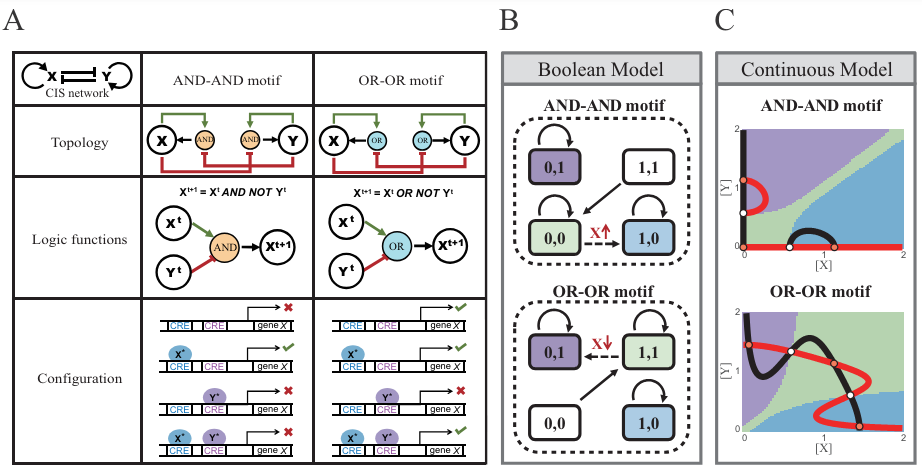 2024年4月23号,北京大学定量生物学中心/生命科学联合中心李志远课题组与北京大学定量生物学中心/北京国际数学研究中心张磊团队合作在国际学术期刊eLife上发表了题为“A logic-incorporated gene regulatory network deciphers principles in cell fate decisions”(DOI: 10.7554/eLife.88742)的研究论文,提出了耦合逻辑组合的基本网络模型计算框架。该研究以生物体系中经常出现的相互抑制自激活网络(CIS,Cross-Inhibition with Self-activation)为基础,同时考虑命运决定中的驱动力模式(噪声驱动/信号驱动)并耦合调控网络中的经典逻辑组合(AND-AND/OR-OR),考察不同的逻辑基序(Logic motif)对细胞命运决定过程的影响。该研究结合理论和数据提炼出命运偏好性、调控逻辑、和噪声特征三者互相依赖的动态变化关系,将基因调控网络中的逻辑基序与命运决定中的进程-准确性权衡联系起来,进而总结了逻辑基序对重编程轨迹的影响。