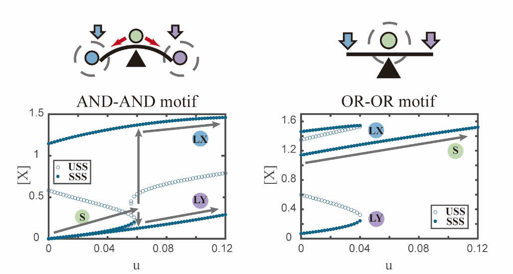 首先,该研究构建了耦合逻辑的二元基因调控网络连续模型,并以相互抑制自激活网络模块为例,系统地阐述了2种逻辑组成(AND-AND motif和OR-OR motif)在2种不同驱动力模式(Noise-driven和Signal-driven)下动力学行为的异同(图2)。