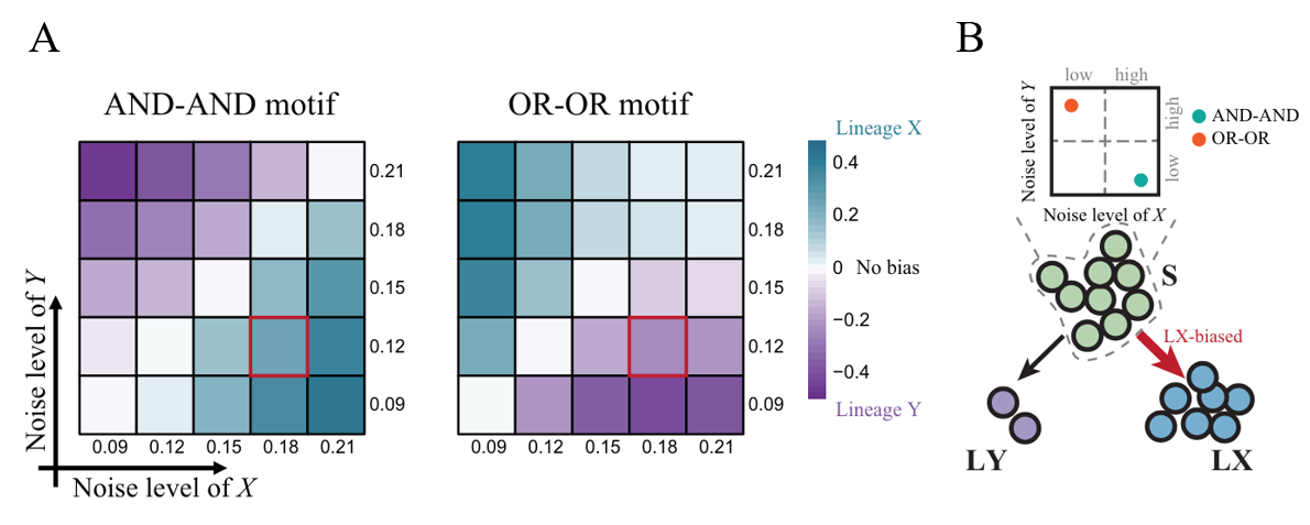 在噪声驱动模式下,给定初始细胞群体基因表达的噪声特征,由噪声驱动的干细胞群体自发且比例稳定地向下游细胞类型进行命运决定。基因调控网络中的逻辑基序会显著影响干细胞命运决定的偏好(图3)。细胞群体的异质性要在逻辑基序为枢纽下对特定的命运偏好作出贡献。进一步,研究者总结了命运偏好性、逻辑基序、噪声特征三者之间在噪声驱动的命运决定过程中的联系。