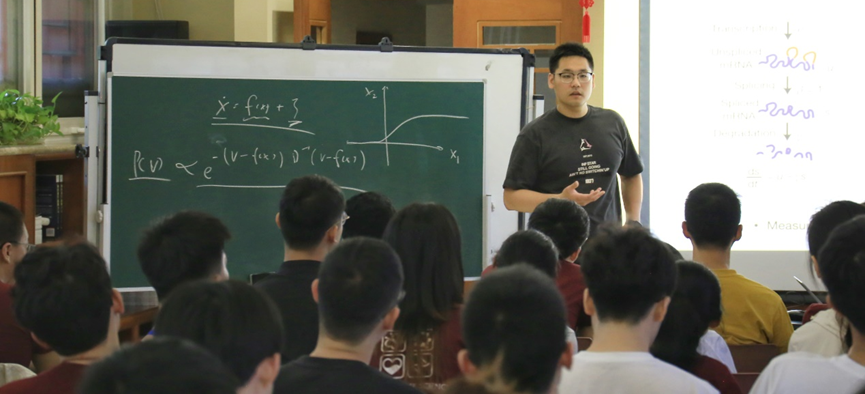 第一天来鲁华老师精彩地阐述了"基于人工智能和物理模型的药物分子设计"。她深入浅出地介绍了药物分子设计的传统流程以及人工智能辅助下新的范式,使同学们对该领域有了更深入的认识。接着,韩铭老师以"AI for biophysics"为主题,生动形象地向大家展示了计算方法以及机器学习如何解析细胞内的基因网络以及细胞与细胞、细胞与环境之间的相互作用。林一瀚老师课程的主题是"定量化、智能化视角下的合成生物学",他以严谨的逻辑和生动的例子阐述了自己对交叉科学的深刻理解,鼓励同学们主动学习各领域知识,用多种手段探索系统生物学与合成生物学的奥秘。