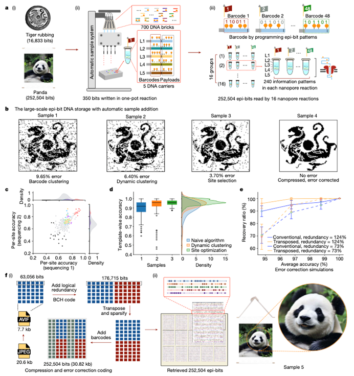 团队在实验中,将中国汉代“白虎”瓦当和国宝大熊猫“飞云”的高清图片成功写入DNA分子中,数据量超过27.5万比特,相比此前发表的其他非传统DNA存储技术,数据规模提升超300倍。信息读取使用便携式纳米孔测序仪,实现了对DNA模板上复杂表观比特信息的高通量读取,并通过单次超240种不同修饰模式的并行解析,无损还原了原始数据。实验结果验证了该创新型分子存储技术的可行性和准确性,还展示了表观比特的稳定性(图2)。