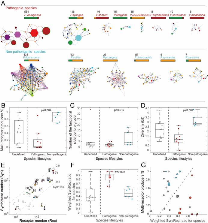 本研究探讨了假单胞菌中铁载体介导的铁互作网络在病原菌和非病原菌之间的差异。根据菌株的生活方式将其分为病原菌和非病原菌组,并预测了每种菌群的铁相互作用网络(图4A)。病原菌中最常见的物种是人类病原菌P. aeruginosa和植物病原菌P. syringae,而非病原菌中最常见的环境物种是P. fluorescens和P. putida,其中许多对宿主中性或有益。研究观察到病原菌和非病原菌在网络拓扑结构上有多个显著差异(图4A)。首先,病原菌菌株主要为单受体生产者或非生产者,而非病原菌菌株主要为多受体生产者(图4A-B)。其次,病原菌的铁载体功能组多样性显著低于非病原菌(图4C),导致病原菌的铁互作网络复杂度低于非病原菌(图4D)。此外,研究还计算了每个锁-钥组的Syn/Rec值,定义为合成酶组和受体组的比值(图4E)。Syn/Rec值接近1表示该锁-钥组中没有欺骗性受体,研究发现,非病原菌的Syn/Rec值显著低于病原菌(图4F)。综合来看,多受体生产者的比例和生产共享型或专一型pyoverdine的偏好在二维平面上清晰地区分了病原菌和非病原菌(图4G)。结果表明,非病原菌形成以共享pyoverdine锁-钥组为主的开放网络,而病原菌则形成以专一pyoverdine锁-钥组为主的闭合网络。进一步分析表明,病原菌网络的简化并非由较低的系统发育多样性引起。