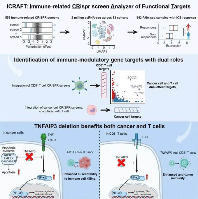 在本研究中,研究团队利用ICRAFT平台,重点解析并实验验证了TNFAIP3(A20)基因的功能,并首次揭示了其在肿瘤微环境中的双重作用。在肿瘤细胞中,TNFAIP3缺失可激活TNF诱导的细胞凋亡通路,并上调NF-κB信号通路,增强趋化因子表达,促进T细胞浸润,使肿瘤细胞对免疫杀伤更加敏感。而在T细胞中,TNFAIP3的失活能够增强CD8+ T细胞的抗肿瘤能力,使其在肿瘤环境中更具杀伤力。换言之,靶向TNFAIP3不仅能够削弱肿瘤细胞的免疫逃逸能力,还能同时提升T细胞的抗癌效力,展现出极大的临床应用潜力。