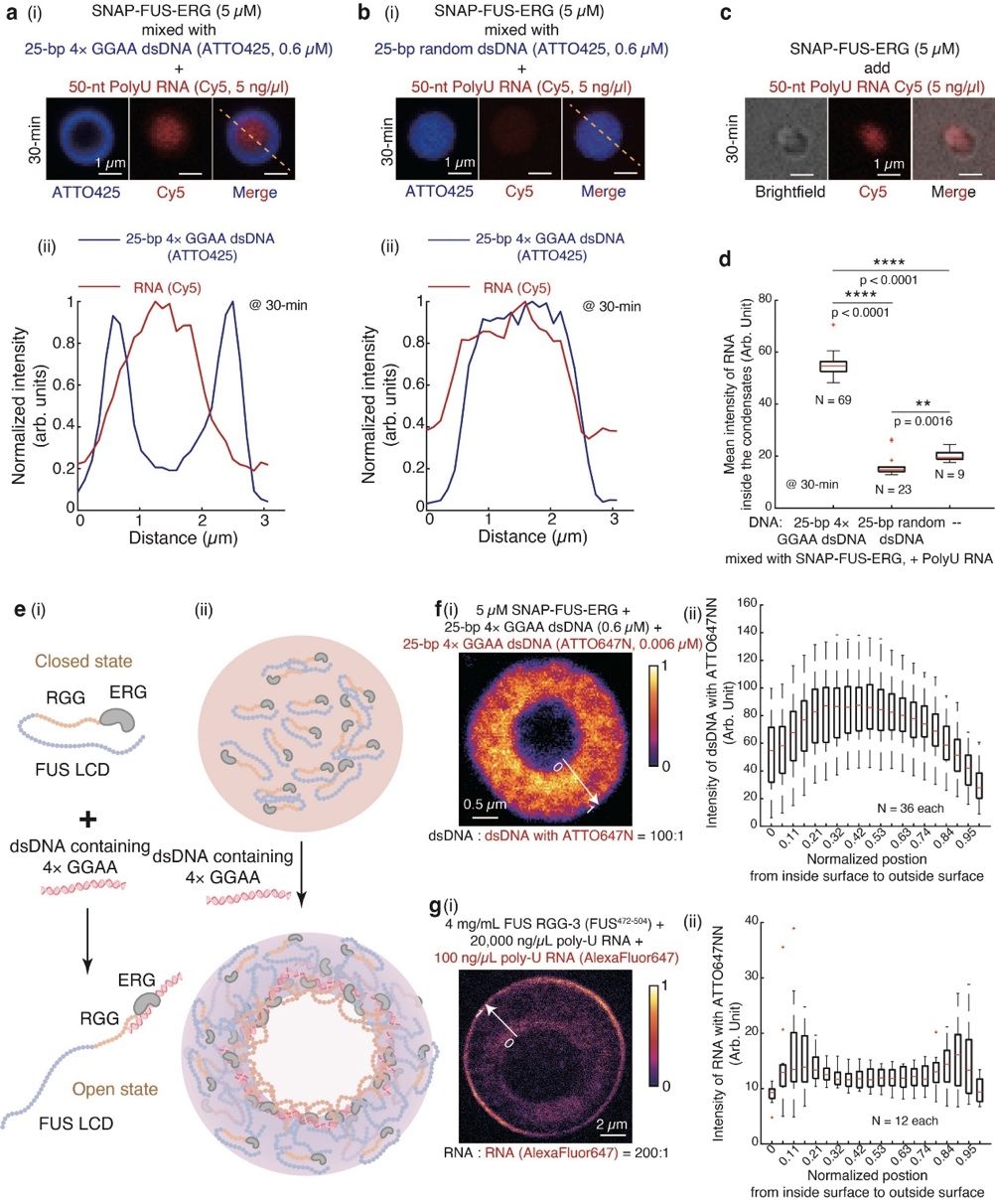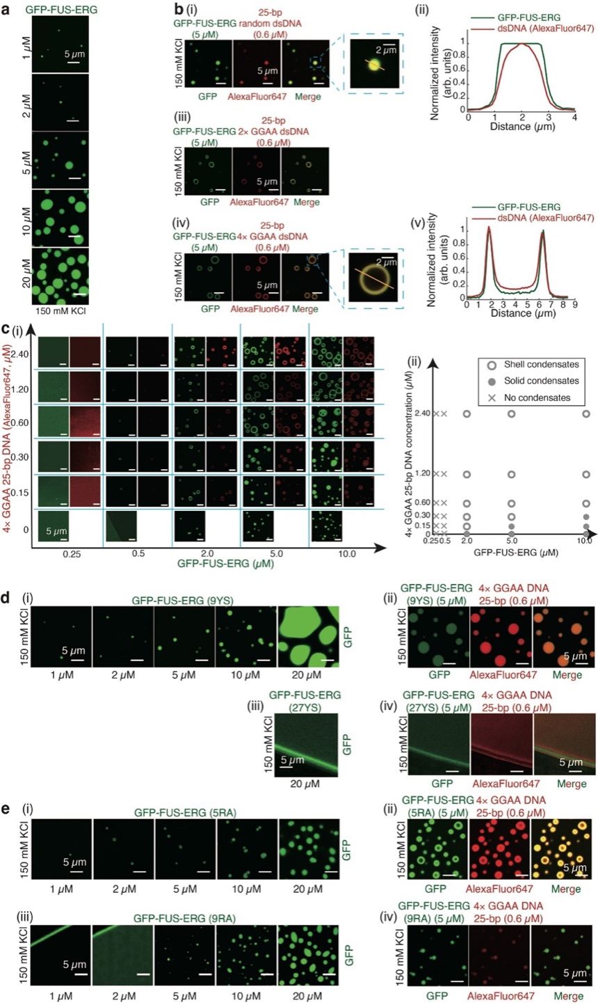 图1. FUS-ERG与GGAA dsDNA形成球壳共凝聚物。
