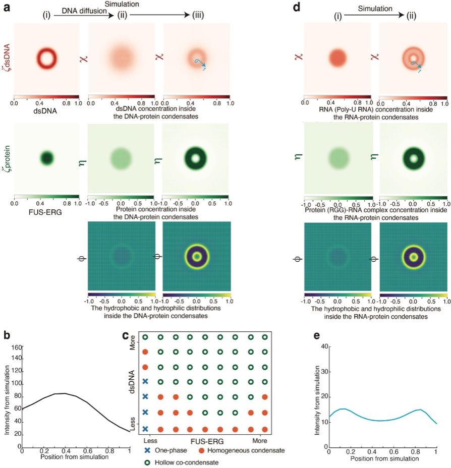 为此,研究团队提出“嵌套不对称相分离”假说:FUS-ERG存在“闭合态”与“开放态”两种构象。在闭合态中,LCD与ERG结构域通过分子间相互作用紧密结合,RGG基序被埋藏;当GGAA dsDNA特异性地结合到ERG的DBD后,触发构象转变为开放态,RGG基序得以暴露。这些开放态的蛋白-DNA复合物向凝聚物内部扩散,暴露的亲水性RGG基序在内部积累形成亲水性内表面,而外部表面则由闭合态蛋白与缓冲液的相互作用维持稳定,最终形成内外表面不对称的中空结构(图2)。