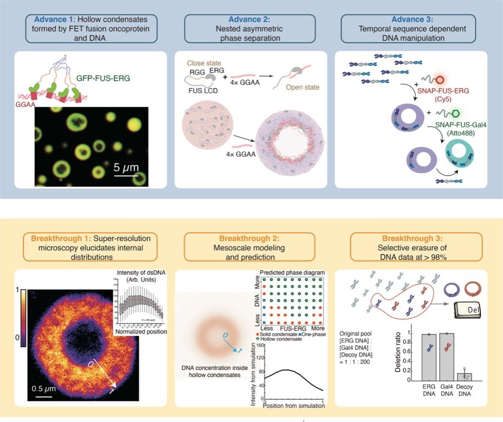 近日,北京大学定量生物学中心齐志课题组、张磊课题组、钱珑课题组与中国科学院过程工程研究所夏宇飞课题组在FET融合致癌蛋白形成球壳凝聚物的研究取得突破性进展。他们发现FET家族融合致癌蛋白FUS-ERG可与含GGAA微卫星序列的双链DNA(dsDNA)形成独特的球壳共凝聚物,并通过体外生化实验、超分辨成像与数学建模相结合的方法,揭示了其“嵌套不对称相分离”的形成机制”。更具独创性的是,研究人员基于FUS-ERG-dsDNA球壳共凝聚物的结构特性,研究人员开发出独特的DNA操控技术,成功实现DNA信息的精准删除及层级分选,为DNA存储领域提供了全新技术路径。相关论文“Deciphering the molecular mechanisms of FET fusion oncoprotein–DNA hollow co-condensates”已发表于Nature Communications。