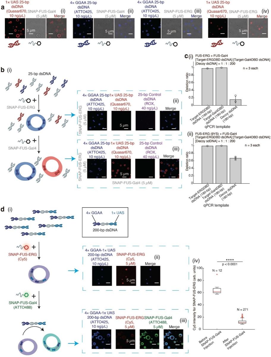 此外,研究团队还构建了具有不同DBD的FET融合蛋白,例如把FUS-ERG中ERG DBD替换为Gal4 DBD得到FUS-Gal4融合蛋白,该人造的融合蛋白只能和具有Gal4特异结合序列的UAS dsDNA形成球壳共凝聚物,而FUS-ERG只能和GGAA dsDNA形成球壳凝聚物一致(图4)。这不仅证明了FET融合蛋白与其对应dsDNA形成球壳凝聚物的分子机制是高度通用的,还提供了更多正交的反应体系,对于解决当前DNA存储领域的技术瓶颈提供有力的技术支持。