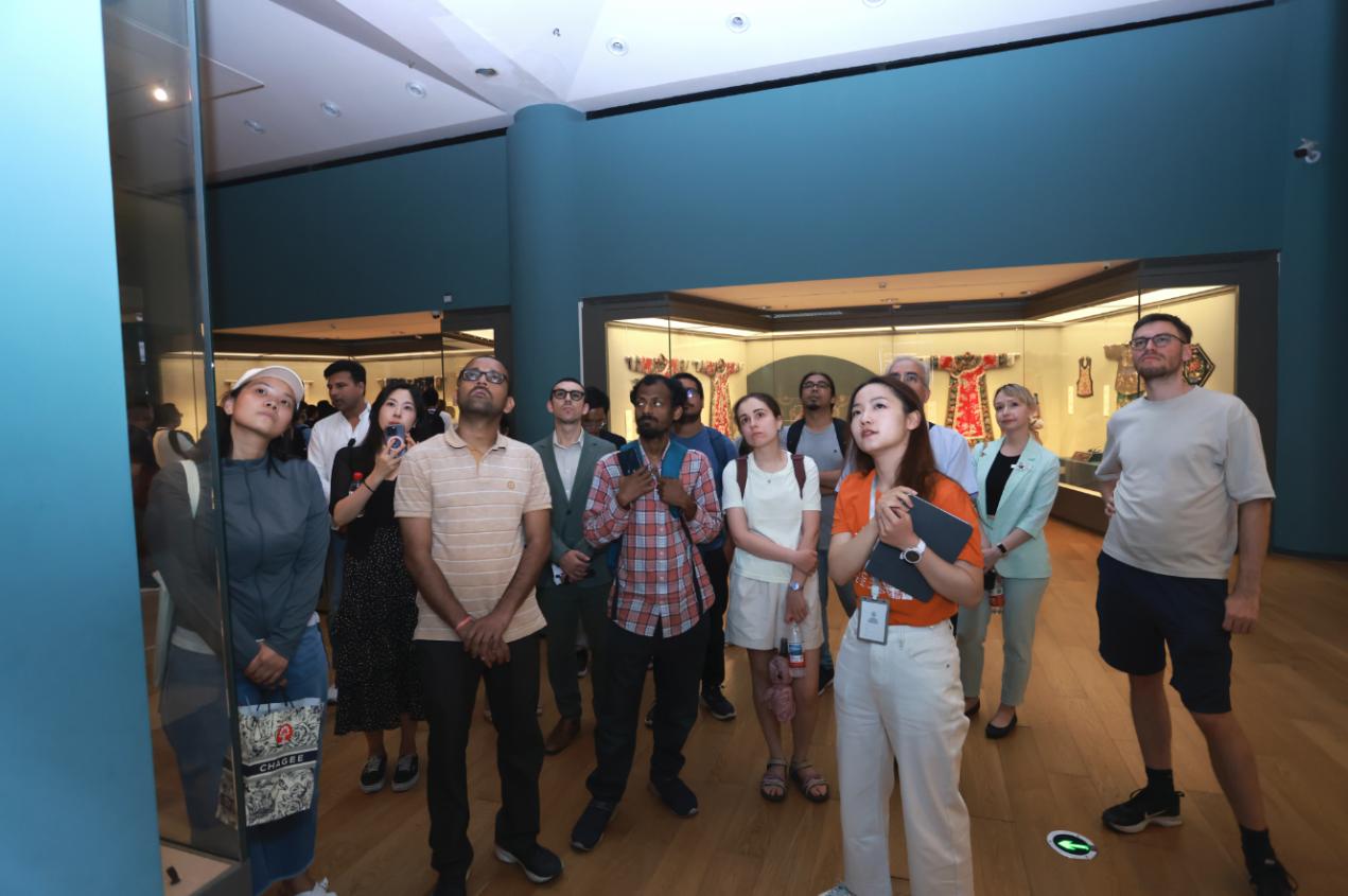 随后,外专们参观了清华大学艺术博物馆。其中,“丝绣华章”展览展出了明清时期代表性织绣品百余件,大家细细品味古人寓设计于巧思的织绣之美,对其中精湛的刺绣工艺和丰富的纹样设计赞不绝口。“随方制象”展览展出了明清时代家具,展品以黄花梨、紫檀等名贵材质为主,包括明代四面齐琴桌、矮翘头案、圈椅等传世精品。家具不仅工艺精湛,更蕴含了中国传统生活美学的深厚底蕴。
