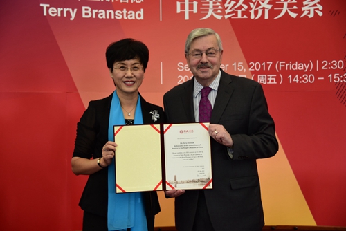 2017年9月15日下午,美国驻华大使泰里·布兰斯塔德(Terry Branstad)一行来访北大,其中包括大使办公室秘书陈南希、经济处官员巴伦·罗布斯坦、公共关系处官员亚伯拉罕·怀斯。作为经济学院105周年院庆活动之一“外国驻华大使眼中的中国经济”系列讲座的首位演讲嘉宾,布兰斯塔德大使在经济学院报告厅就“中美经济关系”发表了主题演讲。