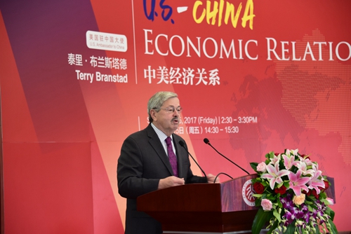 随后,布兰斯塔德大使发表主题演讲。大使先生1984年第一次来到中国,从此便与中国有着千丝万缕的联系。他曾两次被习近平总书记接见,对中国经济的发展表达了崇高的敬意。大使先生在演讲中介绍了近年来美中经济的发展情况。他指出,2008年金融危机之后,美国虽逐渐经济复苏,但仍然面临着地区冲突、恐怖主义、难民潮、贫困、失业等风险和挑战。美中必须相互协作共同解决问题,为营造一个更好的国际环境贡献力量。